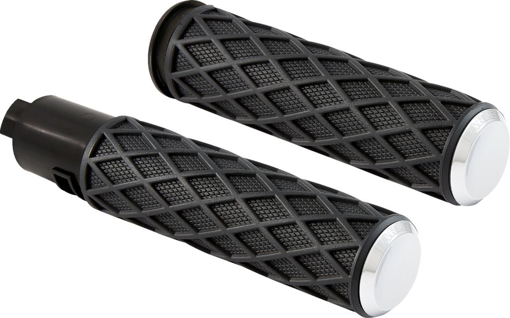 Diamond design rubber grips with integrated knurling inside each diamond shaped pocket for a vintage look with excellent hand traction , Premium rubber grip feels soft and comfortable feel in all riding scenarios and will not wear easily, CNC-machined end caps for a finished look, Arlen Ness laser logo included on each end cap , Installs like factory grips; no glue required for installation