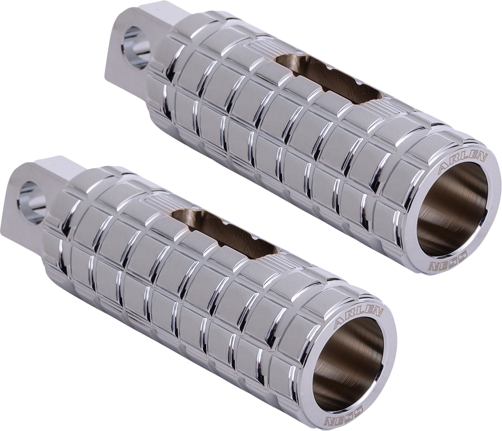 SpeedLiner footpegs feature an oversized 3D knurled billet design, Each peg is CNC machined from billet aluminum, Center cut out pocket adds style & added foot traction, Reduced length for increased ground clearance, Hollow cut out center for reduced weight, Matching floorboards, foot controls, grips & more are also available, Laser engraved Arlen Ness? logo, For standard male mount and M8 Softail? driver/passenger