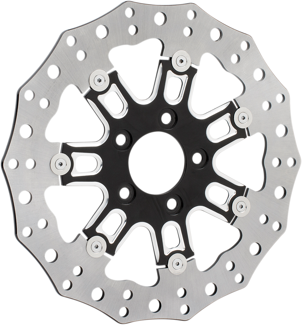 Designed to match Procross forged wheels , High performance floating brake rotors, Outer brake disc is made from 420 stainless steel, drilled and laser cut for optimum friction & durability, Inner carriers are CNC machined from aircraft quality billet aluminum, Will work with Arlen Ness?, factory and aftermarket wheels designed to accept 5-bolt hub mounted HD brake rotors