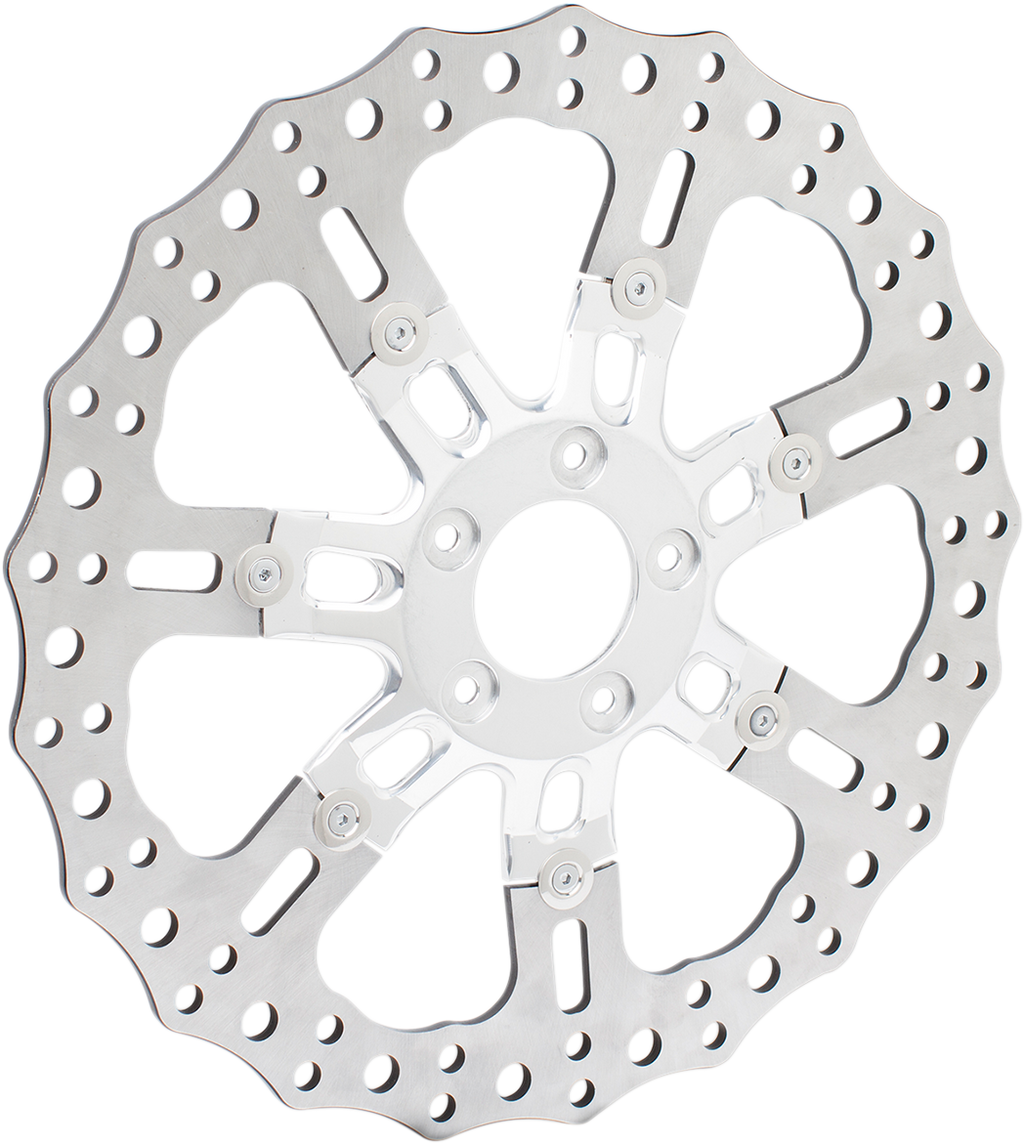 Designed to match Procross forged wheels , High performance floating brake rotors, Outer brake disc is made from 420 stainless steel, drilled and laser cut for optimum friction & durability, Inner carriers are CNC machined from aircraft quality billet aluminum, Will work with Arlen Ness?, factory and aftermarket wheels designed to accept 5-bolt hub mounted HD brake rotors