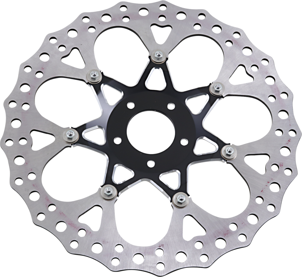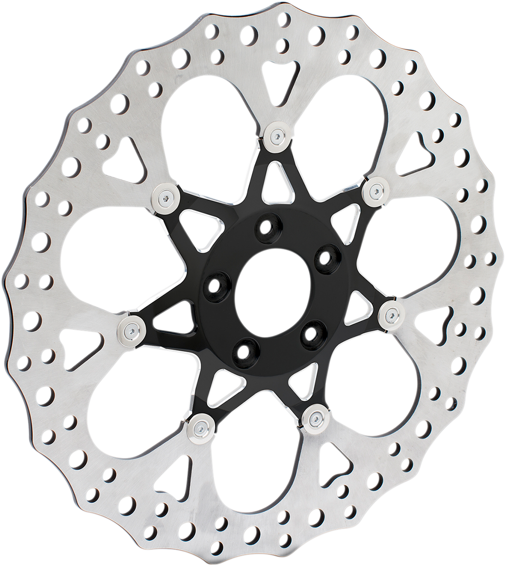 Designed to match Procross forged wheels , High performance floating brake rotors, Outer brake disc is made from 420 stainless steel, drilled and laser cut for optimum friction & durability, Inner carriers are CNC machined from aircraft quality billet aluminum, Will work with Arlen Ness?, factory and aftermarket wheels designed to accept 5-bolt hub mounted HD brake rotors