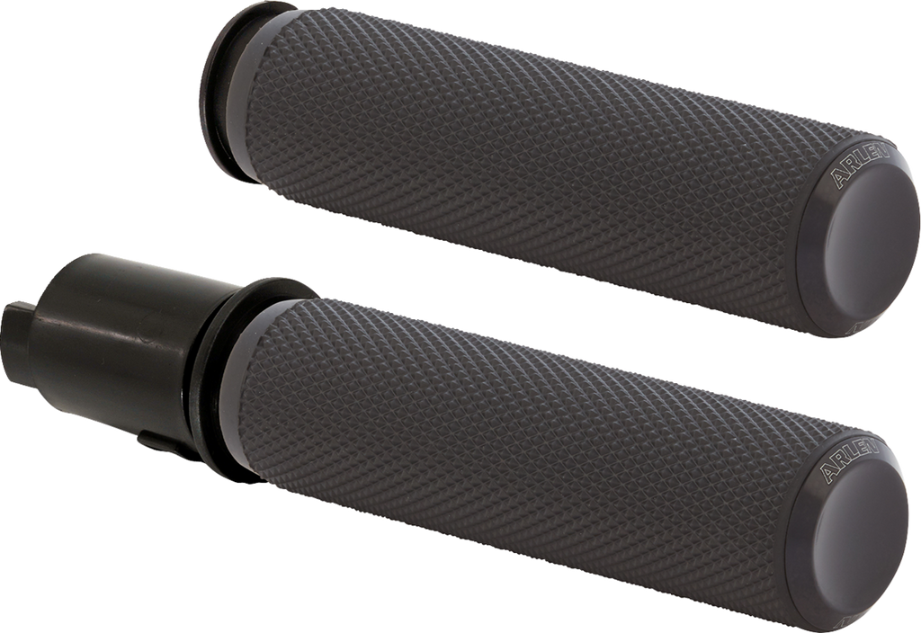 Knurled grips feature a knurled rubber grip area and billet end cap for excellent hand traction with a clean look, Grip end is CNC machined from billet aluminum, Knurled Kraton rubber offers excellent hand grip in all riding conditions, Laser engraved Arlen Ness logo, Matching footpegs and shifter pegs are available separately