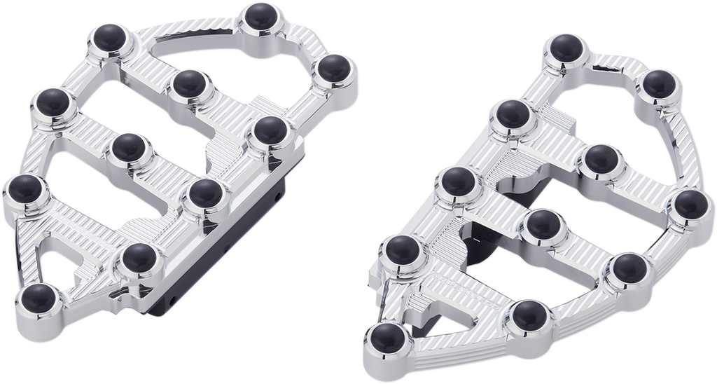 MX floorboards feature a detailed cut through design with integrated rubber inserts for excellent foot traction, CNC machined from a solid block of billet aluminum, Rubber inserts offer foot traction and protect the finish of the aluminum floorboard, replaceable, Extended length for added foot room and comfort, Models with passenger footpegs will require the use of OEM accessory floorboard mounts.