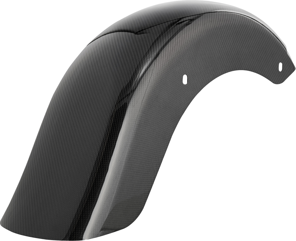 Carbon fiber rear fender made for touring models, Each fender is made from premium grade pre-preg carbon fiber, Smooth, seamless design eliminates side indentations found on stamped factory fenders, Allows flexibility to choose your own custom lighting and license assemblies to set your bike apart, Finished in a high-gloss, UV-resistant clear coat for long-term durability , Pre-cut and drilled for direct bolt-on installation (requires the use of custom license and lighting assemblies which may require custom wiring)