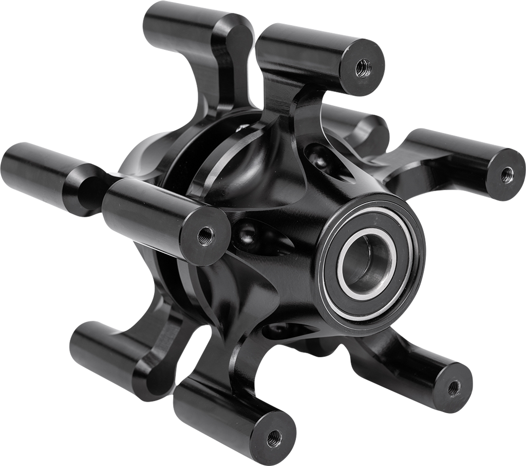 Premium grade hardware with pre-set loctite included with each spider hub, allowing it to be installed in minutes onto Arlen Ness? wheels with simple tools, CNC machined aluminum hub design that features specially designed brake rotor mounts that are integrated into the hub itself for a unique look, Arlen Ness? proprietary Spider design front wheel hub; dual disc, Accepts spoke mounted '08+ FLT touring type front brake rotors and floating brake rotor hardware., Fits '08+ FLT touring models front wheel applications, dual disc rotors.