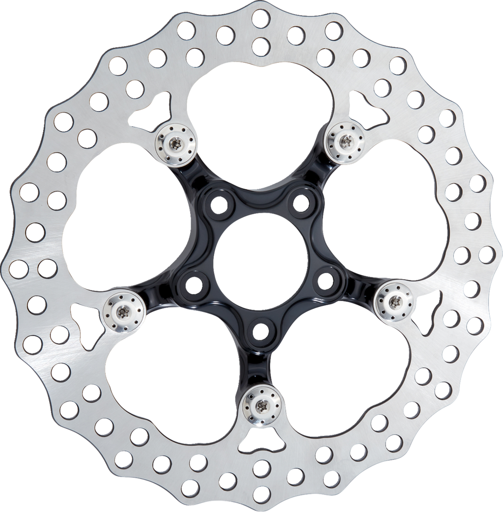 Spider performance brake rotors feature titanium floating rotor hardware, jagged brake discs & CNC machined lightweight billet carriers , Outer brake disc is made from high carbon 420 stainless steel, laser cut then CNC machined to remove all hard edges for a smooth feel, Floating rotor hardware is CNC machined from solid Titanium, Arlen Ness hub kit required to complete wheel on ABS or non-ABS Harley applications.