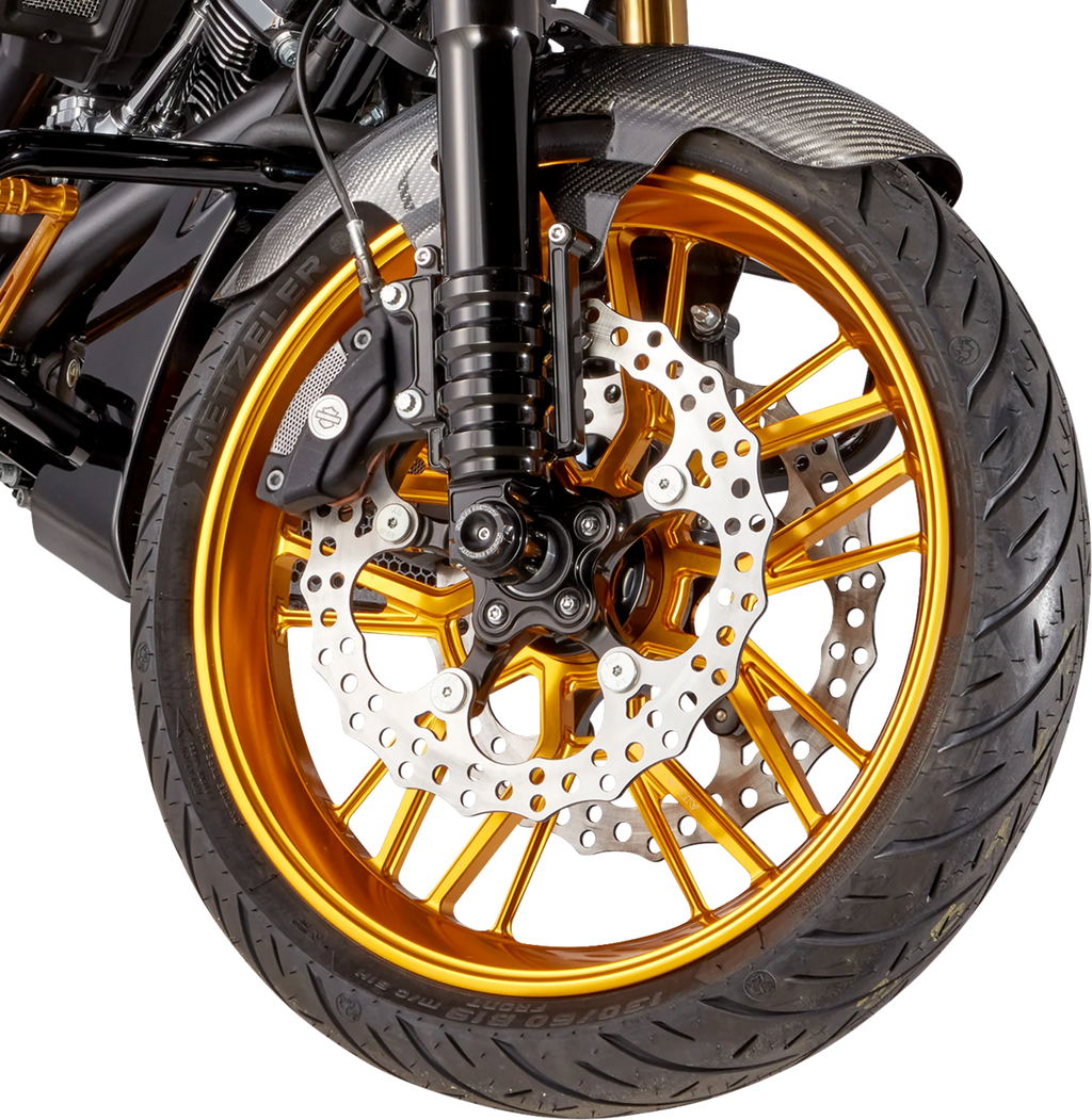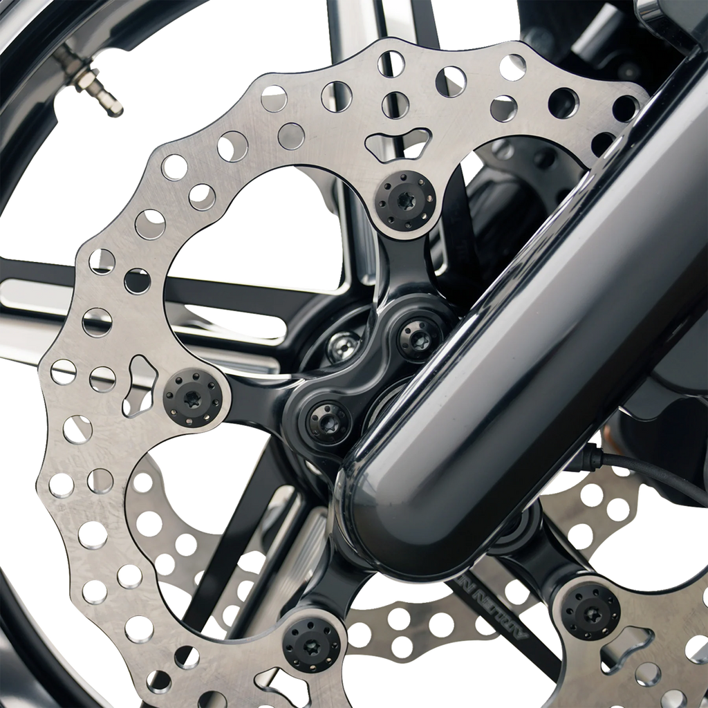 CNC machined rotor adapter/carrier for floating (spoke mount) brake rotors on Arlen Ness? cartridge wheel hubs , Forged from aluminum and then CNC machined into shape , Coped cut out design follows the sculpted lines of Ness cartridge hubs & reduces weight , With an installed 320 mm spoke mount type rotor, the adapter becomes a lightweight complete performance rotor, Mounts to standard 5-bolt HD type wheels with 3.25" bolt circle, Allows the use of factory touring model 320 mm front spoke mounted floating brake rotors on custom wheels., Designed only to be used on all Arlen Ness? wheels with cartridge type wheel hubs.