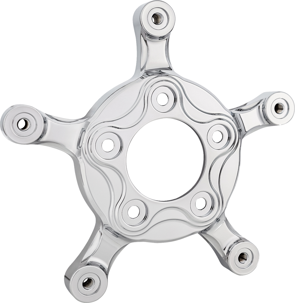 CNC machined rotor adapter/carrier for floating (spoke mount) brake rotors on Arlen Ness? cartridge wheel hubs , Forged from aluminum and then CNC machined into shape , Coped cut out design follows the sculpted lines of Ness cartridge hubs & reduces weight , With an installed 320 mm spoke mount type rotor, the adapter becomes a lightweight complete performance rotor, Mounts to standard 5-bolt HD type wheels with 3.25" bolt circle, Allows the use of factory touring model 320 mm front spoke mounted floating brake rotors on custom wheels., Designed only to be used on all Arlen Ness? wheels with cartridge type wheel hubs.