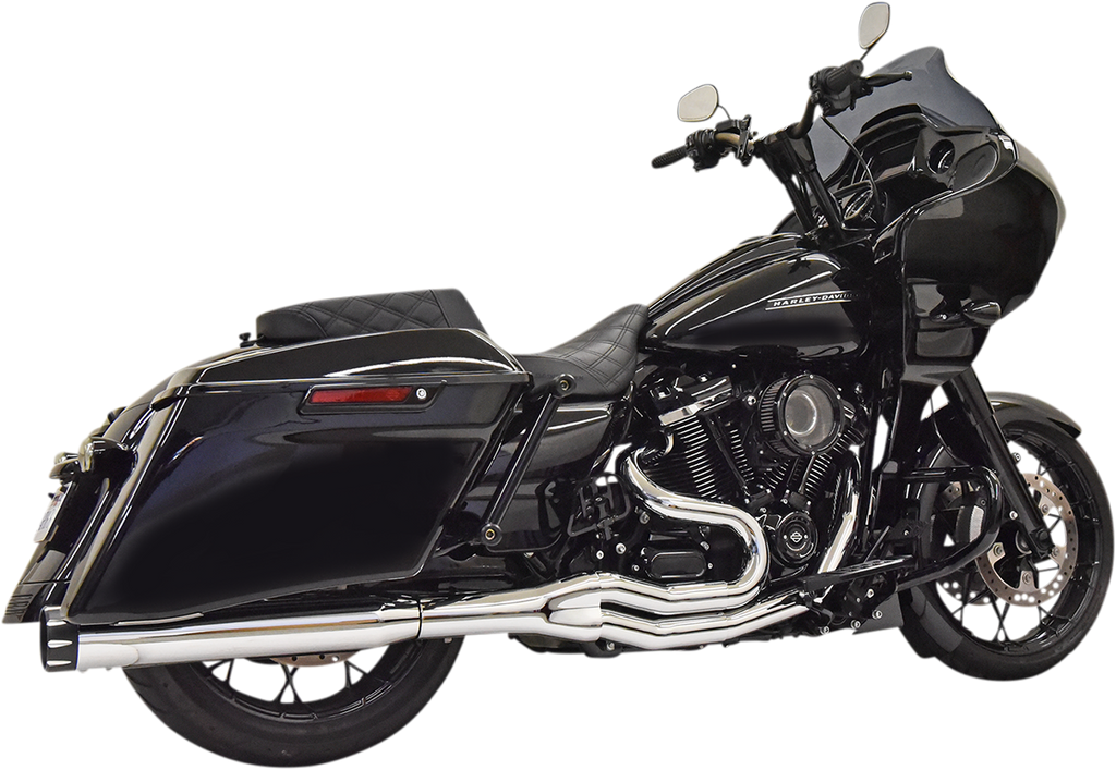 Developed in conjunction with Chris Rivas to develop the right system to address M-Eight big motor builds , Features equal-length stepped headpipes from 1-3/4" into 2" and then 2-1/8", 4" muffler housing has 3" louvered removable baffle, Includes full heat shields, billet end cap, 18 mm O2 bung and 12 mm adapters, Recommended for bikes with motor builds above 140 horsepower